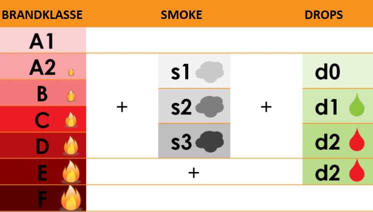 D0 : la lettre D désigne la chute de gouttelettes ou de particules enflammées pendant un incendie. Plus il y en a, plus le feu peut se propager rapidement.